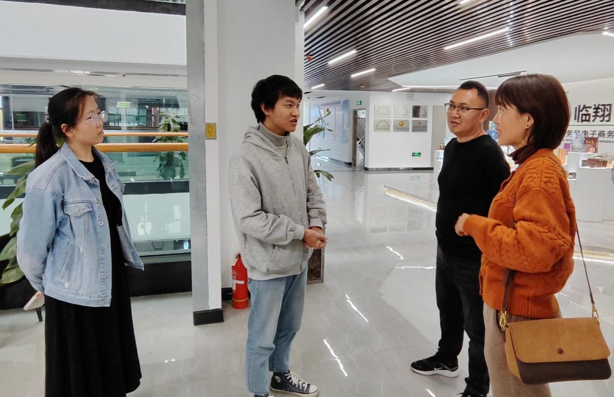 首先,刘绍彬一行与在岗实习生进行了深入交谈,了解学生的实习动态,关切其遇到的困难,并就实习工作纪律、未来就业准备等进行了殷切的嘱托。随后,参观了电商中心产品展示区和办公区,详细了解了电商中心的运营模式、组织架构和相关业务发展情况。最后,与临翔区商务局电商中心主任杨滔就学生实习情况、行业发展现状、校企合作前景、实践课程共建等进行了深入研讨。