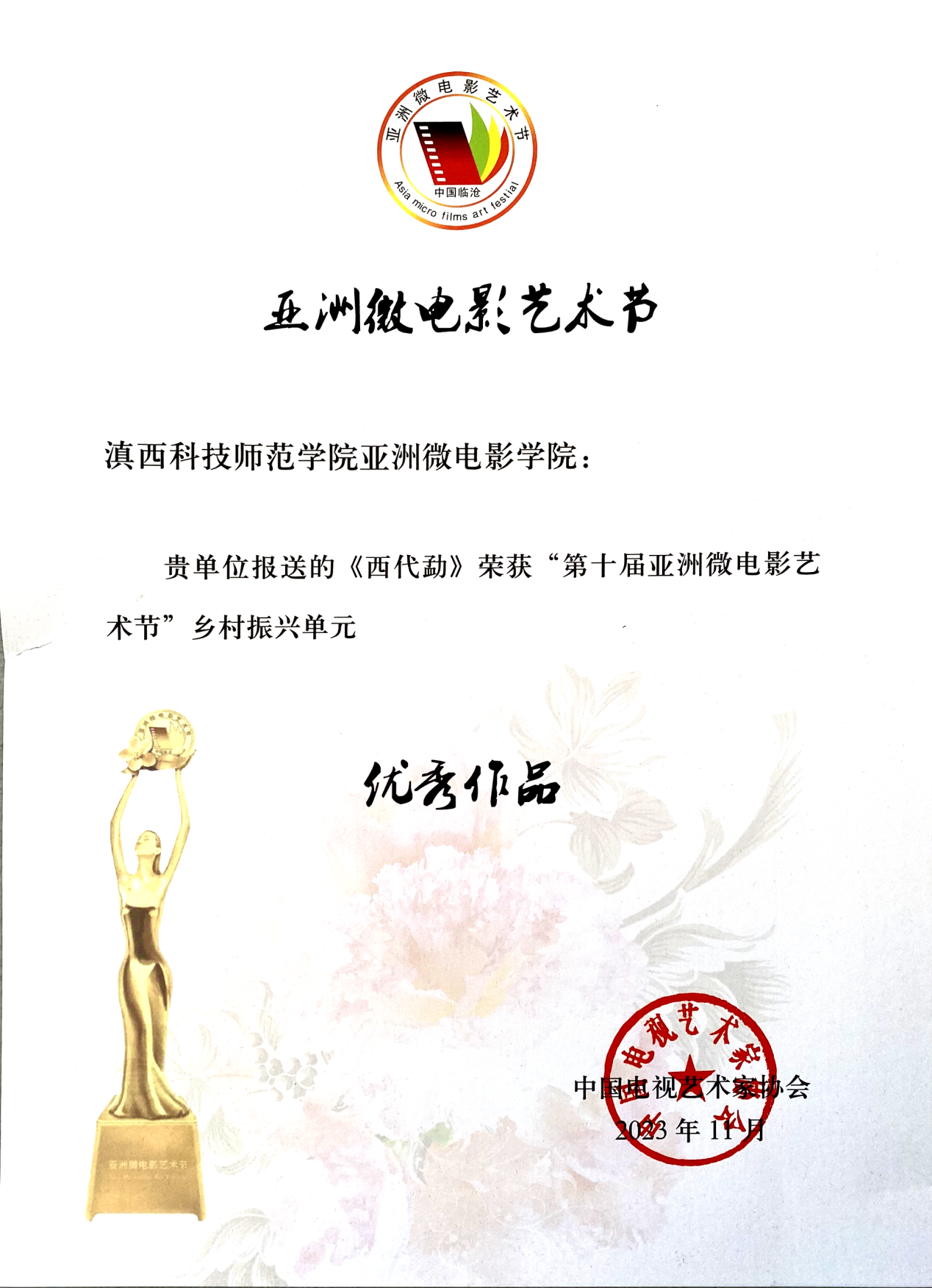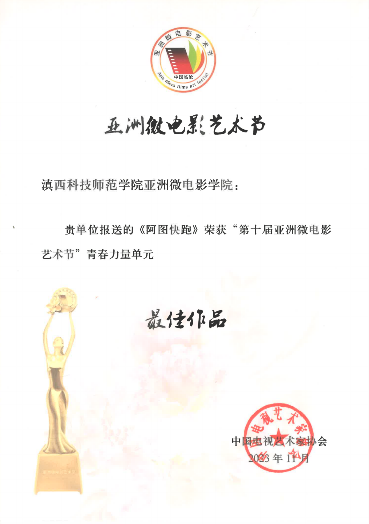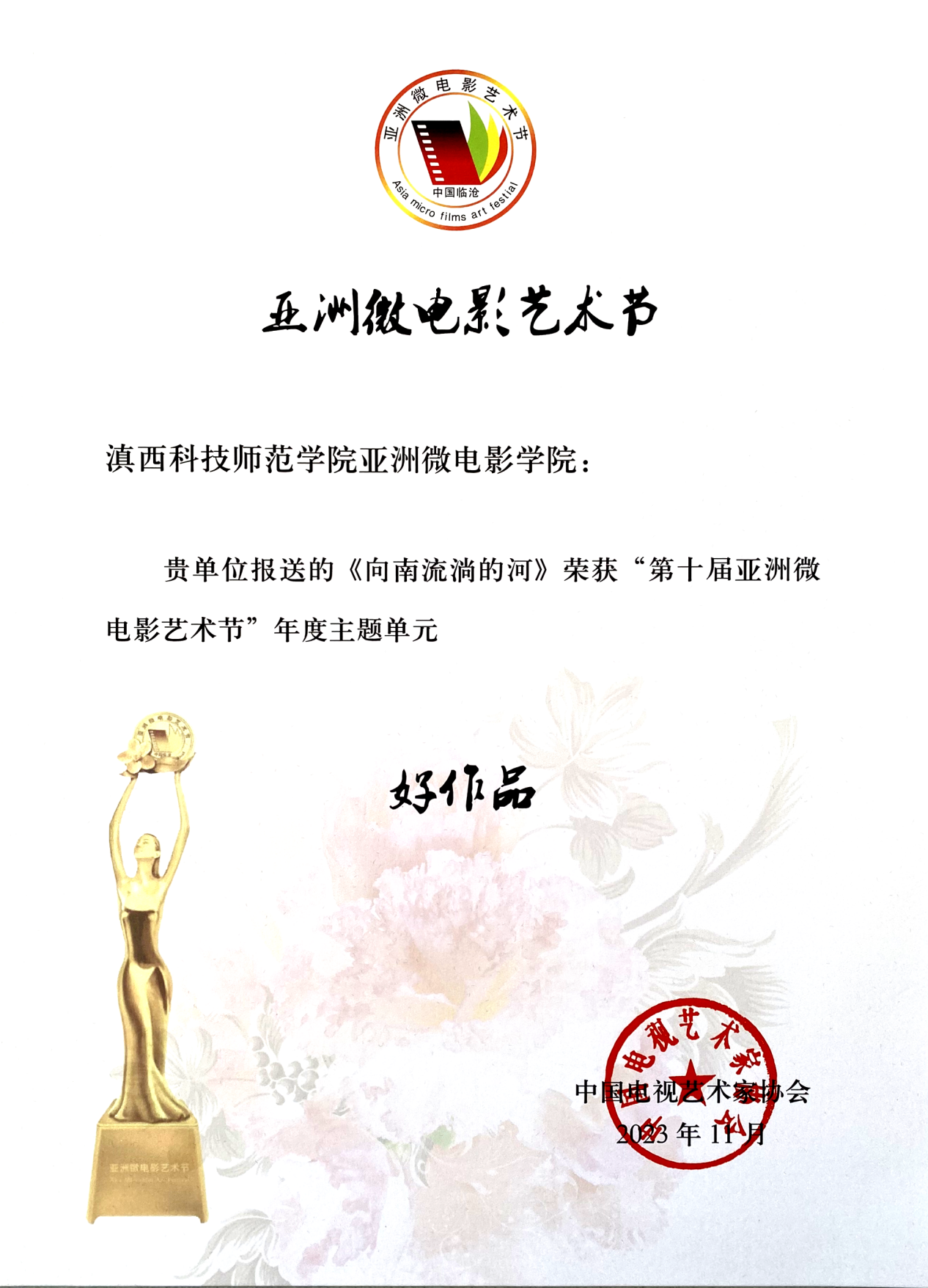 (供稿/雷雨婷 供图/亚洲微电影学院)11月26日,第十届亚洲微电影艺术节颁奖典礼在云南临沧隆重举行,亚洲微电影学院报送的《阿图快跑》获青春力量单元“最佳作品奖”,《青春飞扬的歌》获青春力量单元“优秀作品奖”,《芒团造纸》获文明之光单元“优秀作品奖”,《西代勐》《安东山之恋》获乡村振兴单元“优秀作品奖”;《向南流淌的河》获年度主题单元“好作品奖”。