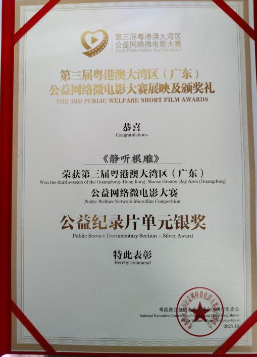 10月21日下午,第三届粤港澳大湾区(广东)公益网络微电影大赛展映及颁奖典礼在广州圆满落幕。由我院罗金文老师指导,张萌、钱子妍、罗文华、杨佳慧四位同学共同创作的公益纪录片《静听根雕》脱颖而出,一举荣获公益纪录片单元银奖、公益纪录片单元演员银奖及公益纪录片单元最佳摄影奖三项荣誉,充分展现了我院师生扎实的专业素养与深切的社会关怀。
