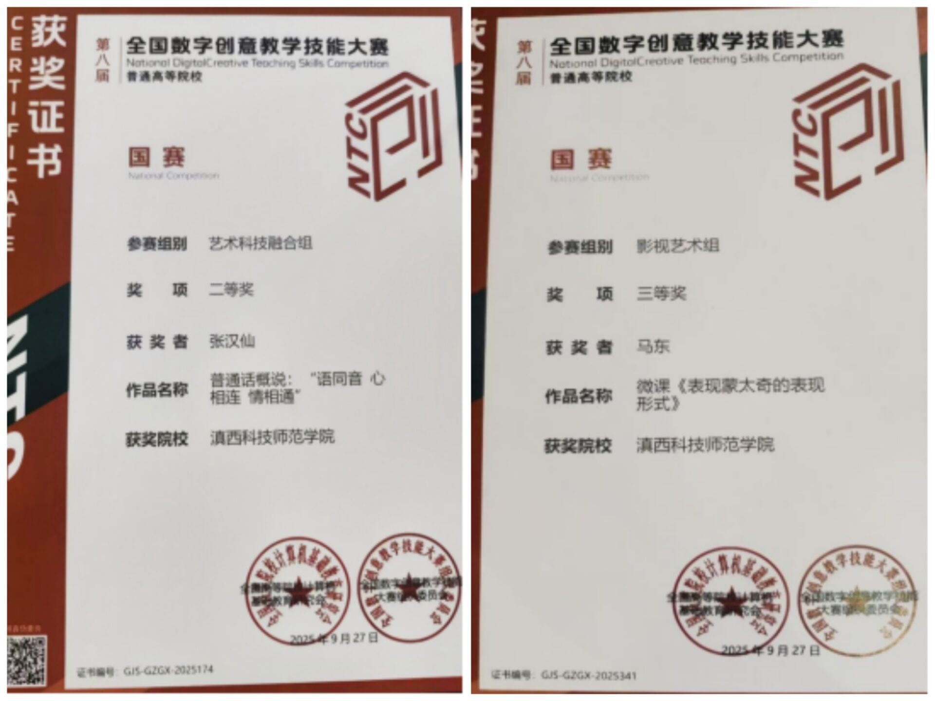 此次大赛中,张汉仙老师凭借作品《普通话概说:“语同音 心相连 情相通”》在艺术科技融合组中荣获二等奖;马东老师则以微课作品《表现蒙太奇的表现形式》在影视艺术组中荣获三等奖。