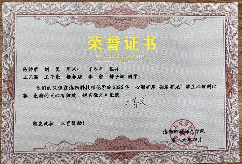 4月17日,我校2026年“心潮有岸,剧幕有光”大学生心理情景剧比赛圆满落幕。亚洲微电影学院的原创心理剧《心有归处,镜有微光》凭借真挚的情感表达、专业的舞台呈现和深刻的思想内涵,荣获大赛二等奖。