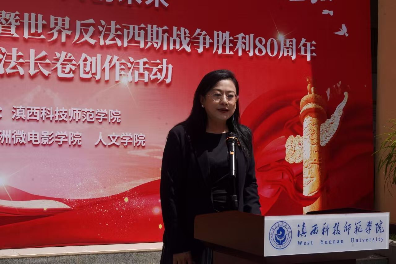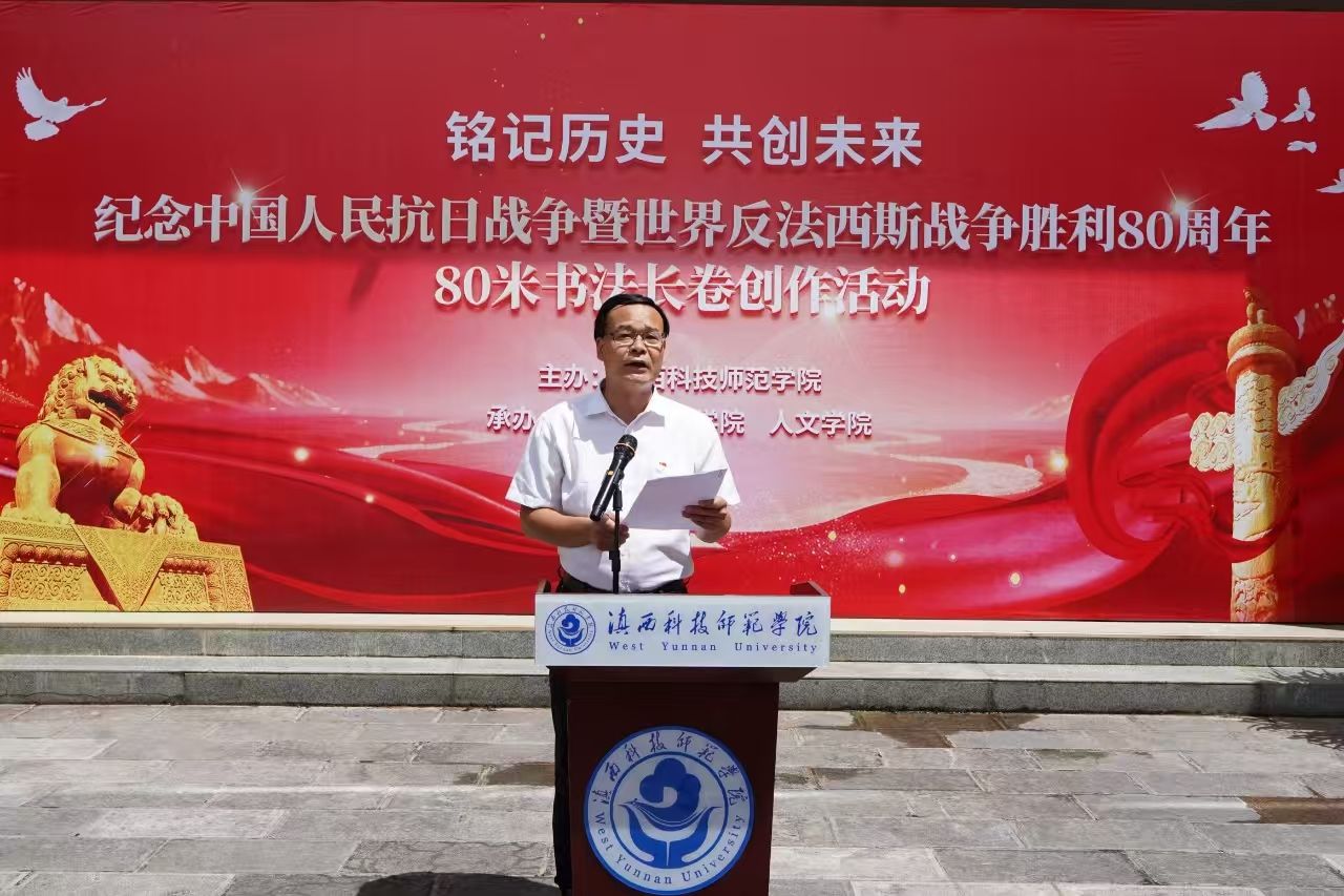 阮凤斌在致辞中指出,此次活动以书法长卷创作纪念抗战胜利80周年,旨在铭记历史、共创未来。他强调,伟大抗战精神是中华民族宝贵的精神财富,希望师生通过笔墨感悟历史、传承精神,作为国门高校,滇西科技师范学院始终坚守“为党育人、为国育才”的使命,服务边疆发展。他鼓励教师将红色文化融入教学,引导学生成长成才;期望学生勤学笃行、奋发有为,成为堪当民族复兴大任的时代新人,为建设祖国、服务边疆贡献青春力量。