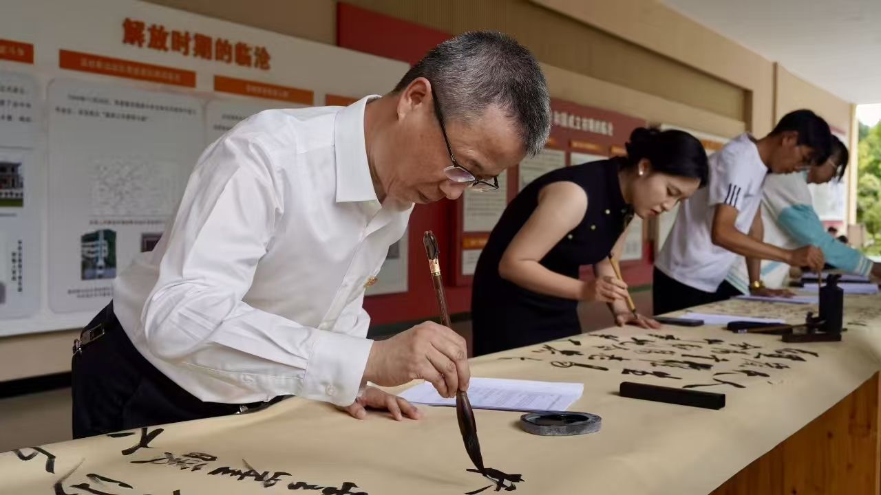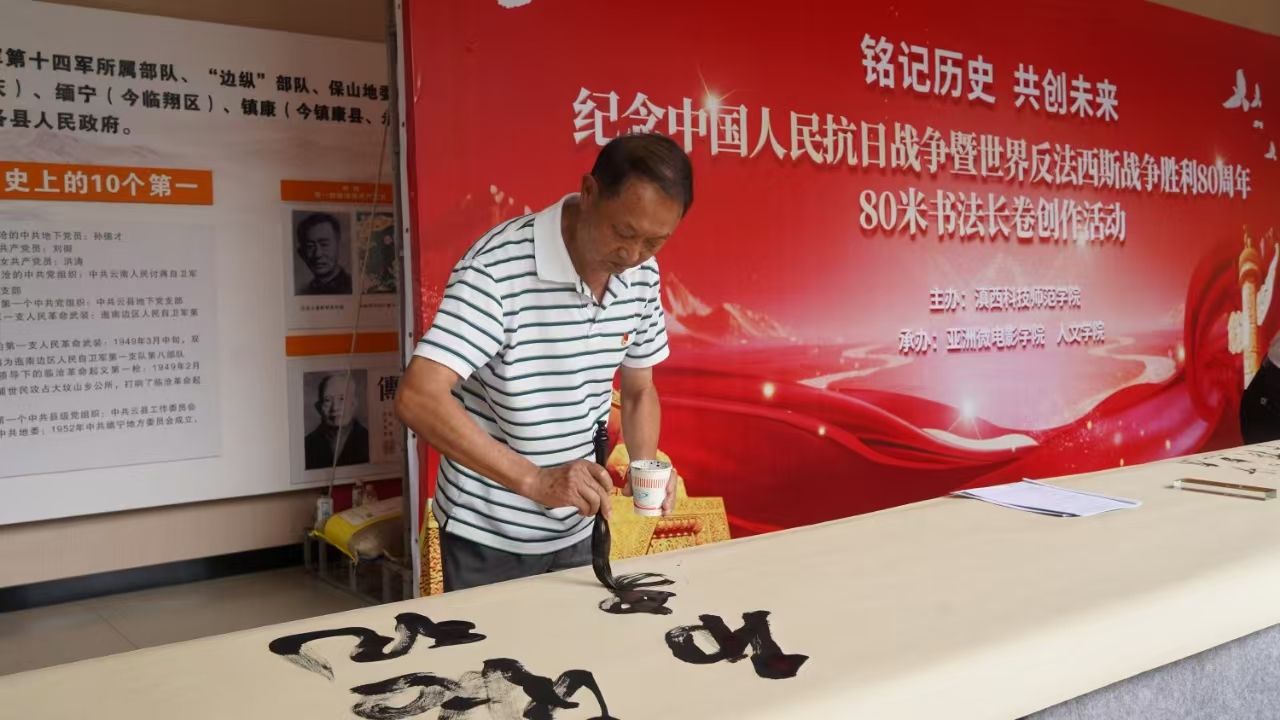 2025年8月29日下午,亚洲微电影学院与人文学院在学校边境地区红色文化传承教育实践基地开展“铭记历史 共创未来”联合主题党日活动,以80米书法长卷创作的形式,纪念中国人民抗日战争暨世界反法西斯战争胜利80周年,校党委书记阮凤斌出席活动并致辞,校党委副书记、校长刘艳红出席活动并宣布活动启幕。
