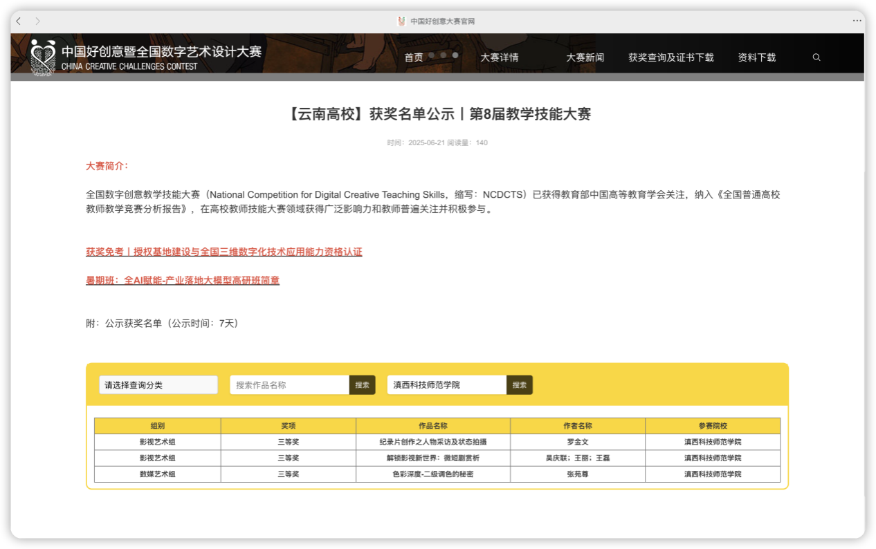近日,备受瞩目的全国数字创意教学技能大赛获奖名单公示,亚洲微电影学院教师罗金文、吴庆联在大赛中荣获省级三等奖。
