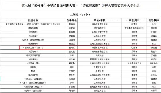 在“诗意彩云南”讲解大赛中,石哏练同学的作品《凉州词二首》(其一)获得大学生组三等奖。