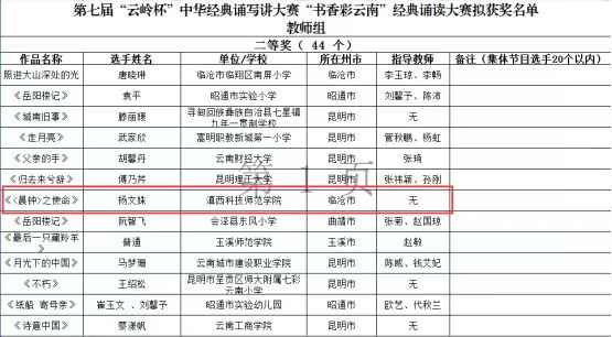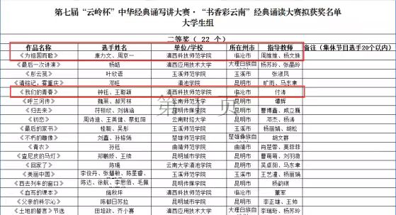在“书香彩云南”经典诵读大赛里,周京一、康力文同学的作品《为祖国而歌》(指导教师:周维维、杨文姝)荣获大学生组二等奖;王聪颖、钟钰同学的作品《我们的青春》(指导教师:付涛)获得大学生组二等奖;杨文姝老师的作品《<晨钟>之使命》荣获教师组二等奖。