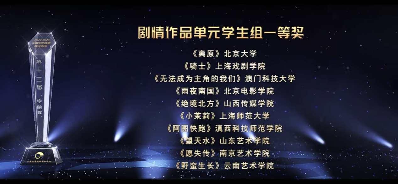 (文/杨敬宜、马倩茹 图片来源于网络) 10月21日晚,中国高校影视学会2022-2023年度学术成果、影视作品推优活动暨第十三届“学院奖”颁奖仪式在北京电影学院怀柔校区举行。滇西科技师范学院亚洲微电影学院2018级毕业生毕业作品《阿图快跑》获剧情作品单元学生组一等奖。
