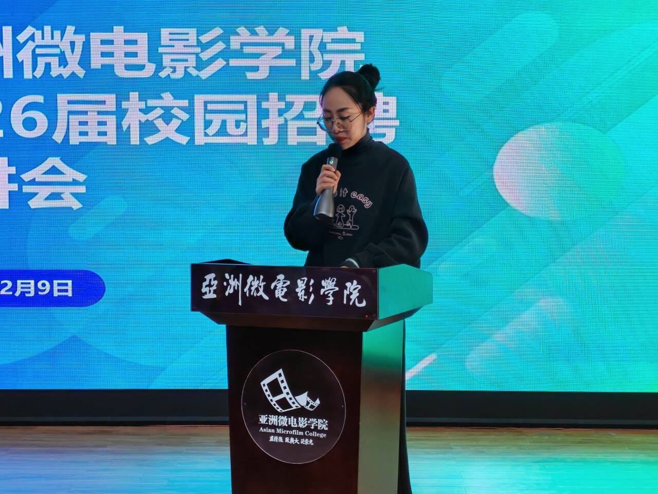 12月9日下午,亚洲微电影学院2026届毕业生校园招聘宣讲会顺利举行。铭应传媒与初木山传媒有限公司应邀参会,现场进行招聘宣讲,为学院学生提供了多元的就业岗位与发展机会。本次招聘会由亚洲微电影学院学生工作办公室主任杨文姝主持。