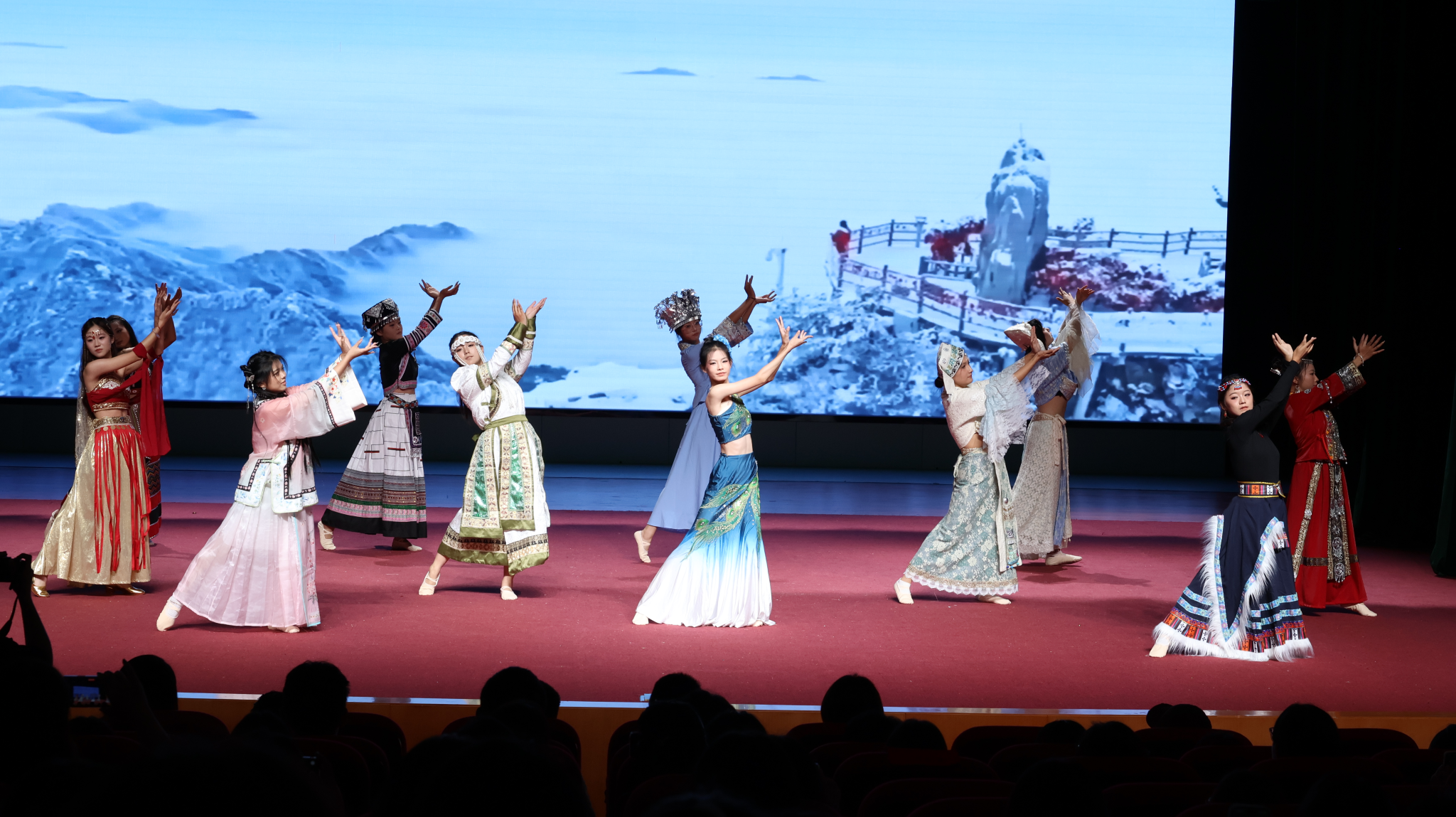 “共聚·同梦而行”环节将晚会推向高潮。葫芦丝与书法共创的《月光下的凤尾竹》韵味独具,乐墨交融引来满堂喝彩;终场群舞《民族大交融》热情奔放,生动诠释了各民族“像石榴籽一样紧紧拥抱”的深厚情谊,彰显了滇西多民族共生共融的地域文化,也深刻体现了学院“以文化人”的育人理念。