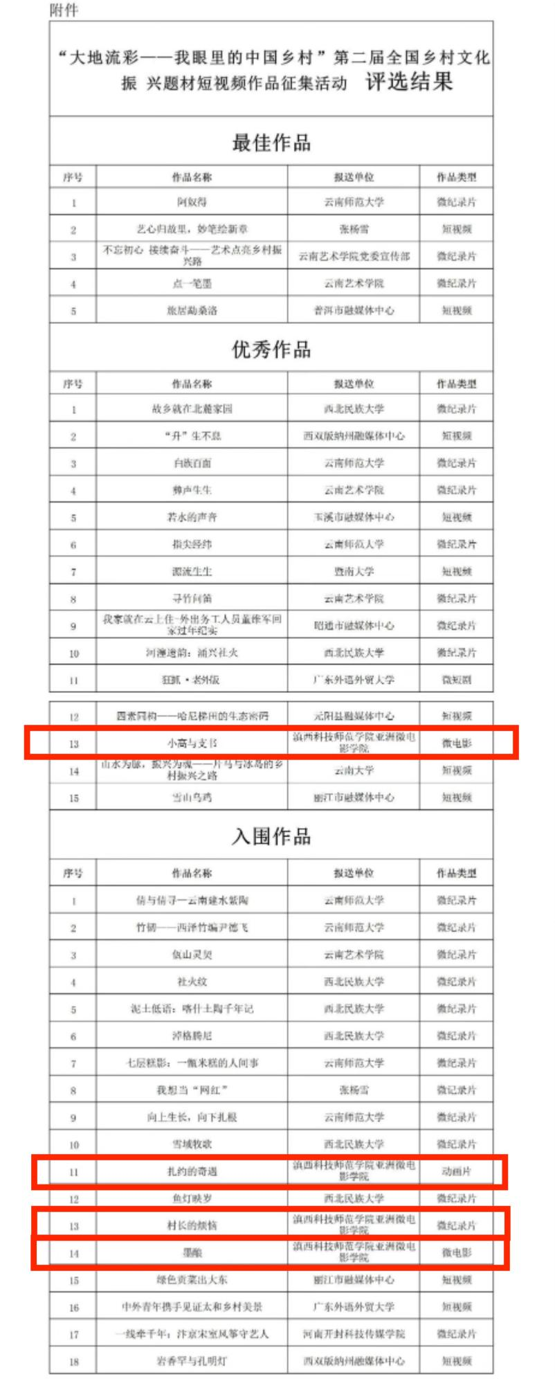 近日,由云南省文学艺术界联合会、云南广播电视台联合主办,云南省电视艺术家协会、云南省电影家协会承办的“大地流彩——我眼里的中国乡村”第二届全国乡村文化振兴题材短视频作品征集活动评选结果公示,滇西科技师范学院亚洲微电影学院有4个作品获得荣誉。其中,微电影《小高与支书》(2022级新媒体艺术班方艳蕊团队作品,指导教师:张浩然)获评“优秀作品”;动画片《扎约的奇遇》(2021级新媒体艺术班刘存玲团队作品,指导教师:罗金文)、微纪录片《村长的烦恼》(2022级新媒体艺术班张员毓团队作品,指导教师:张浩然)、微电影《墨酿》(2022级新媒体艺术班罗小龙团队作品,指导教师:张浩然)三部作品获评“入围作品”。